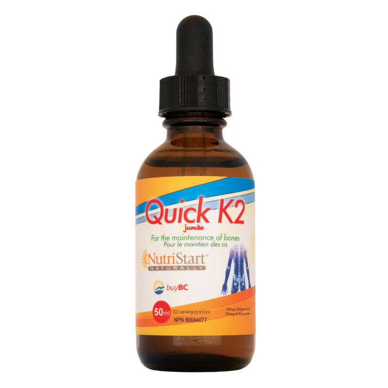 Many Vitamin K2 products come with added vitamin D3. Nutristart chose not to do this because while 120mcg, the daily allowable serving of K2, is sufficient for most people’s needs, the allowable dosage of vitamin D3, in Canada, is only 1,000 IU, and many people now choose to take more D3 than that. Therefore, by taking our D3 as a separate supplement we can attain the levels recommended by current experts in the field, rather than being limited to 1,000 IU as when it is combined with the daily dose of K2.